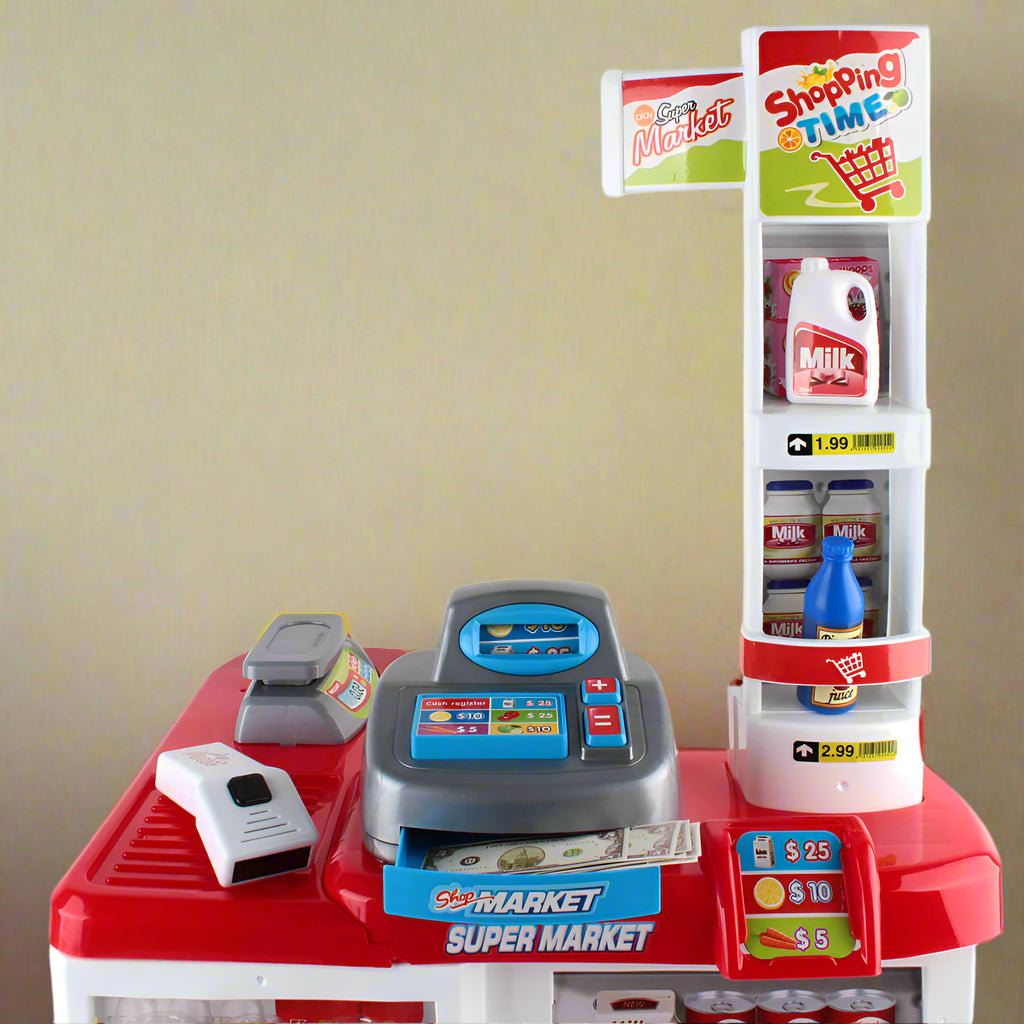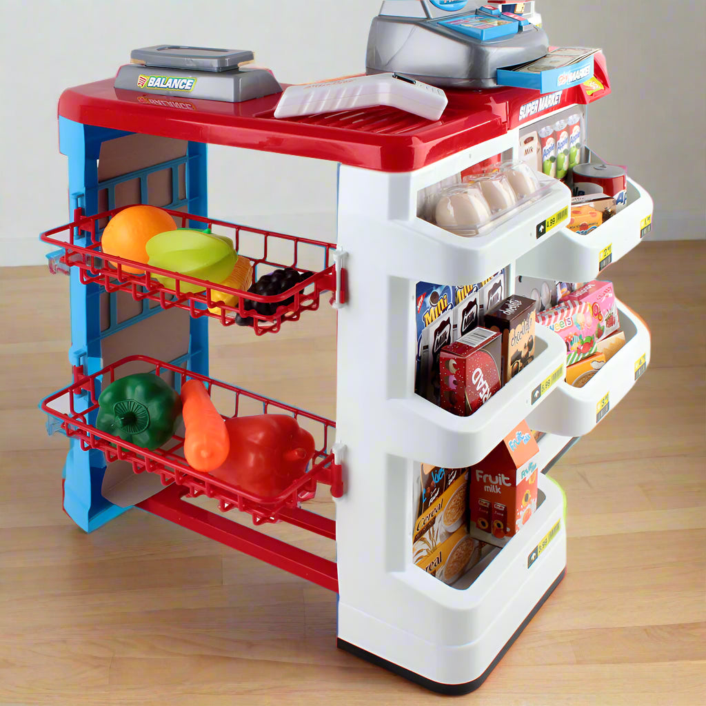 Featuring a colourful supermarket pretend play set with 24pcs accessories, this pretend play set is perfect for kids to perform shopping role plays with friends and parents. The play set comes with a mini trolley allowing kids to role play as a customer. Also, included a barcode scanner with sound and lighting features; just like a real one! While the play set provides plenty of fun during play, it is also an excellent educational learning play set for kids; encouraging teamwork, communication, expression and logic exercises. Let's bring this fun and creative supermarket pretend play set home for your loving ones.