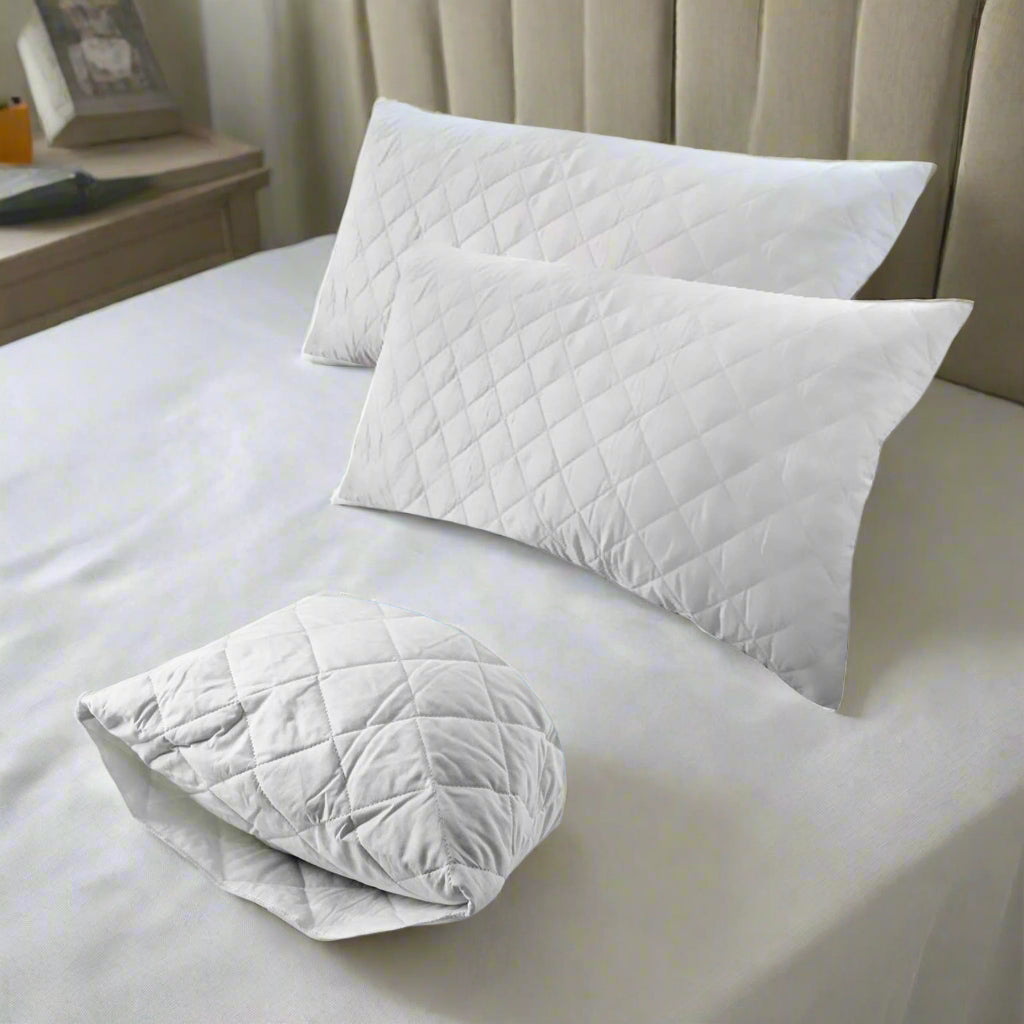 This Twin Pack of Quilted Cotton King Pillow Protectors 51 x 91 cm by Jason will protect your pillows from dust mites and stains while keeping it fresh and prolong its life. It features diamond quilted design, bleached cotton cover with envelope opening. It is made from quality 100% Cotton fabric and 100gsm polyester filling.
